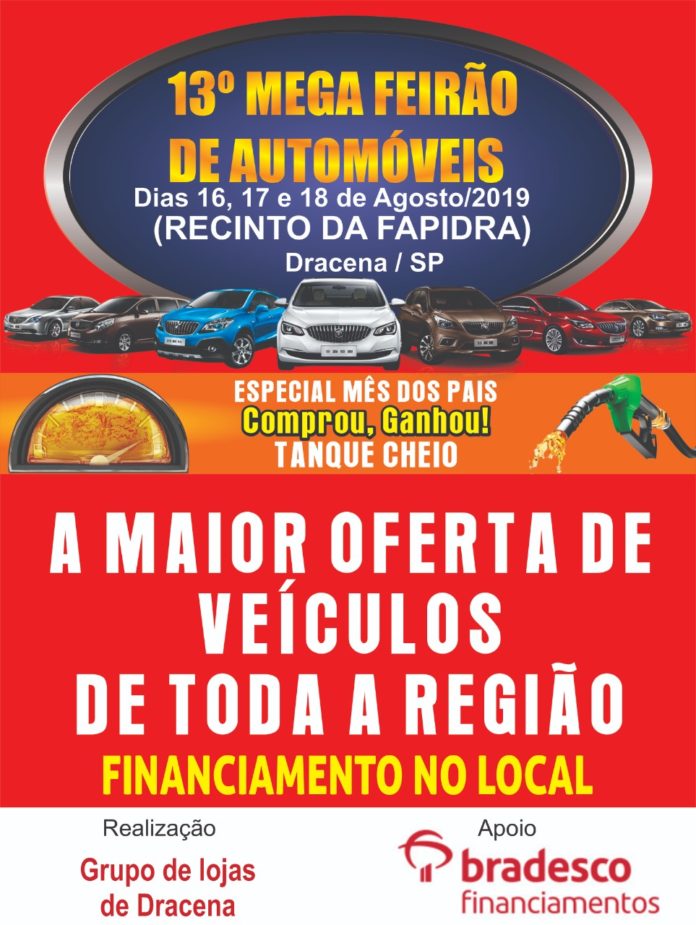 Nos dias 16. 17 e 18 de agosto acontece no recinto da Fapidra em Dracena, o 13º Mega Feirão de Automóveis.