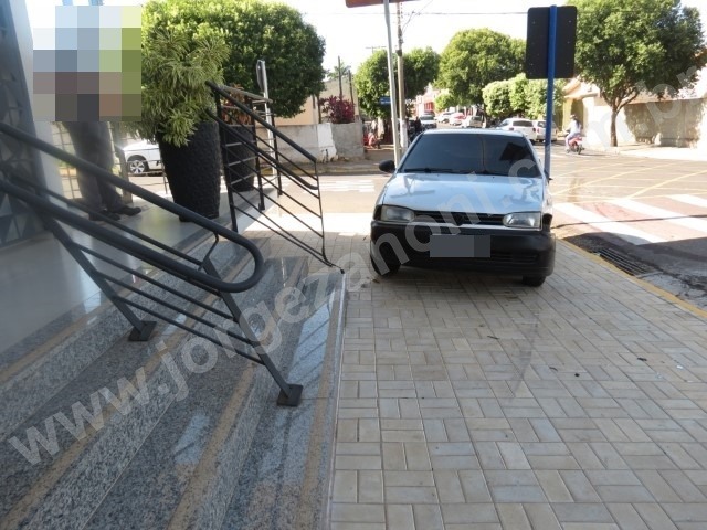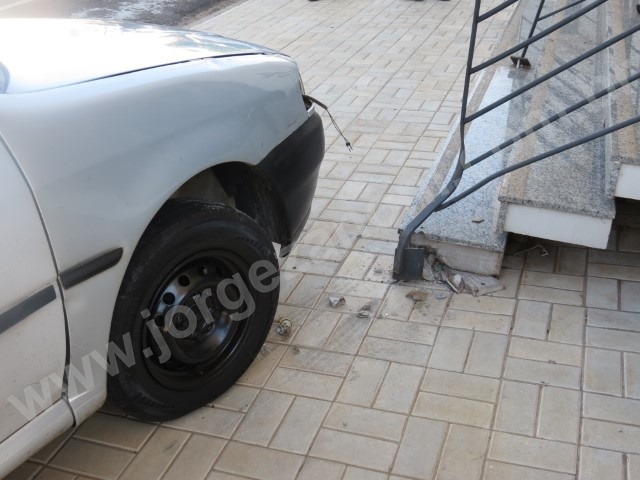 Com o impacto da batida o veículo Gol foi arremessado para cima da calçada de uma Clínica e acabou atingindo uma placa de sinalização e o corrimão da escada do prédio.
