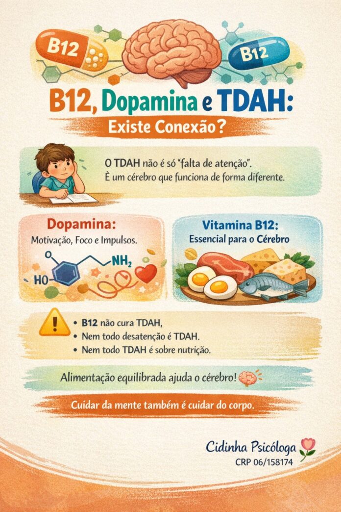Quando falamos em TDAH, não estamos olhando apenas para o comportamento, mas para um cérebro que precisa de equilíbrio, cuidado e suporte adequado. A dopamina participa diretamente dos processos de foco, motivação e controle dos impulsos, e a vitamina B12 contribui para que esse sistema funcione de maneira mais eficiente.