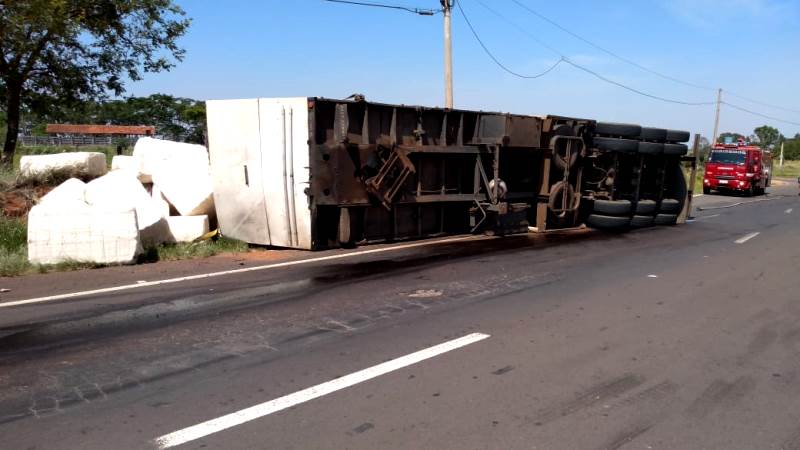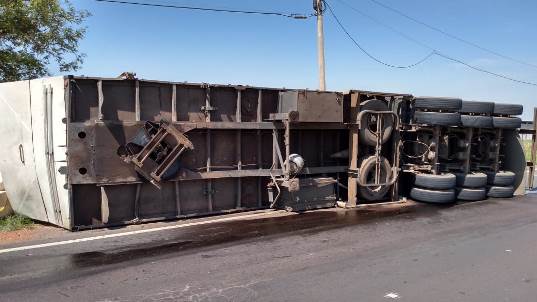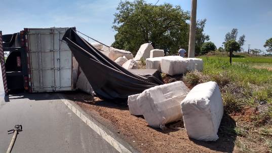 Uma carreta carregada com fardos de algodão tombou por volta das 9h30 da manhã desta terça-feira (19), na Rodovia Comandante João Ribeiro de Barros (SP-294), trecho em que está localizado o trevo de acesso à Rodovia Plácido Rocha que liga à Lagoa Seca em Adamantina.