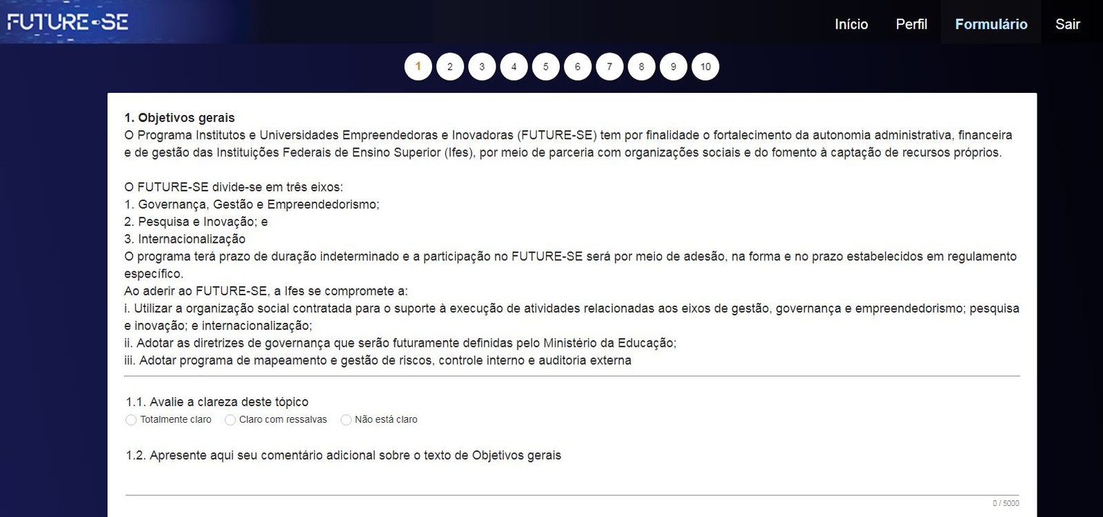 A cada capítulo, os participantes poderão responder a perguntas objetivas sobre se consideram o texto “totalmente claro”, “claro com ressalvas” ou “não está claro”. Há também pelo menos um campo por capítulo no qual os participantes poderão incluir comentários por escrito. Na décima e última página do formulário, há outro campo de texto aberto para um “comentário geral sobre a proposta do programa”.