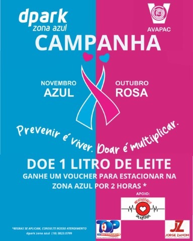 A arrecadação faz parte da “CAMPANHA OUTUBRO ROSA, NOVEMBRO AZUL” em parceria DPARK Zona Azul e AVAPAC com apoio do SITE JORGE ZANONI e TOP TV.