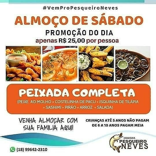 Geral e Comércio Hoje (28) tem Peixada Completa no Pesqueiro Neves By admin - dezembro 28, 2019 0 1445 Share Facebook Twitter Google+ Pinterest WhatsApp Compartilhar no WhatsappEstrada Municipal José Mazzoni, próximo a AABB em Dracena. Compartilhar no Whatsapp