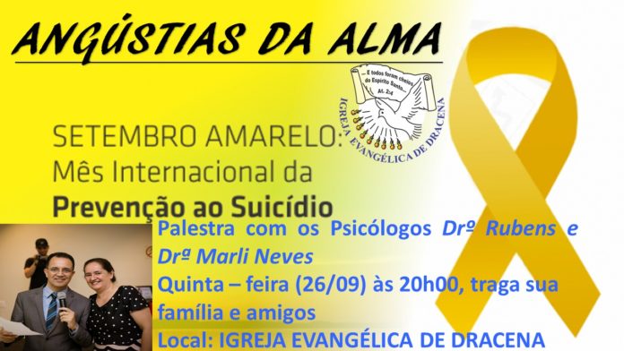 Agenda Hoje tem Palestra na Igreja Evangélica de Dracena By admin - setembro 26, 2019 0 1387 Share Facebook Twitter Google+ Pinterest WhatsApp Compartilhar no WhatsappPalesta Angústias da Alma dentro do setembro amarelo, no mês internacional da prevenção ao Suicídio. Compartilhar no Whatsapp