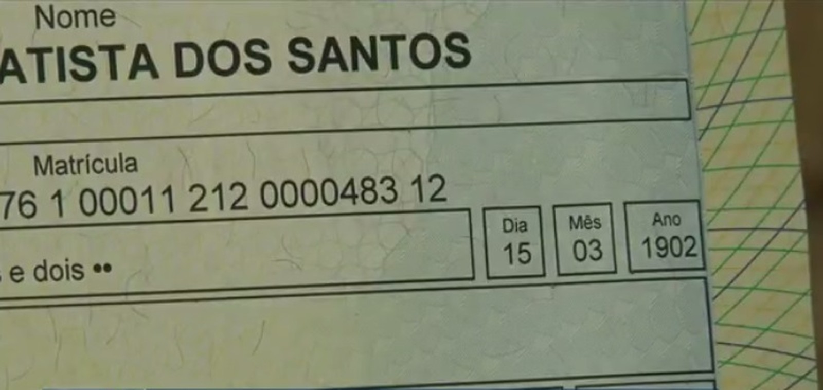 Registro de nascimento comprova que homem nasceu em 1902 — Foto: Reprodução/RPC