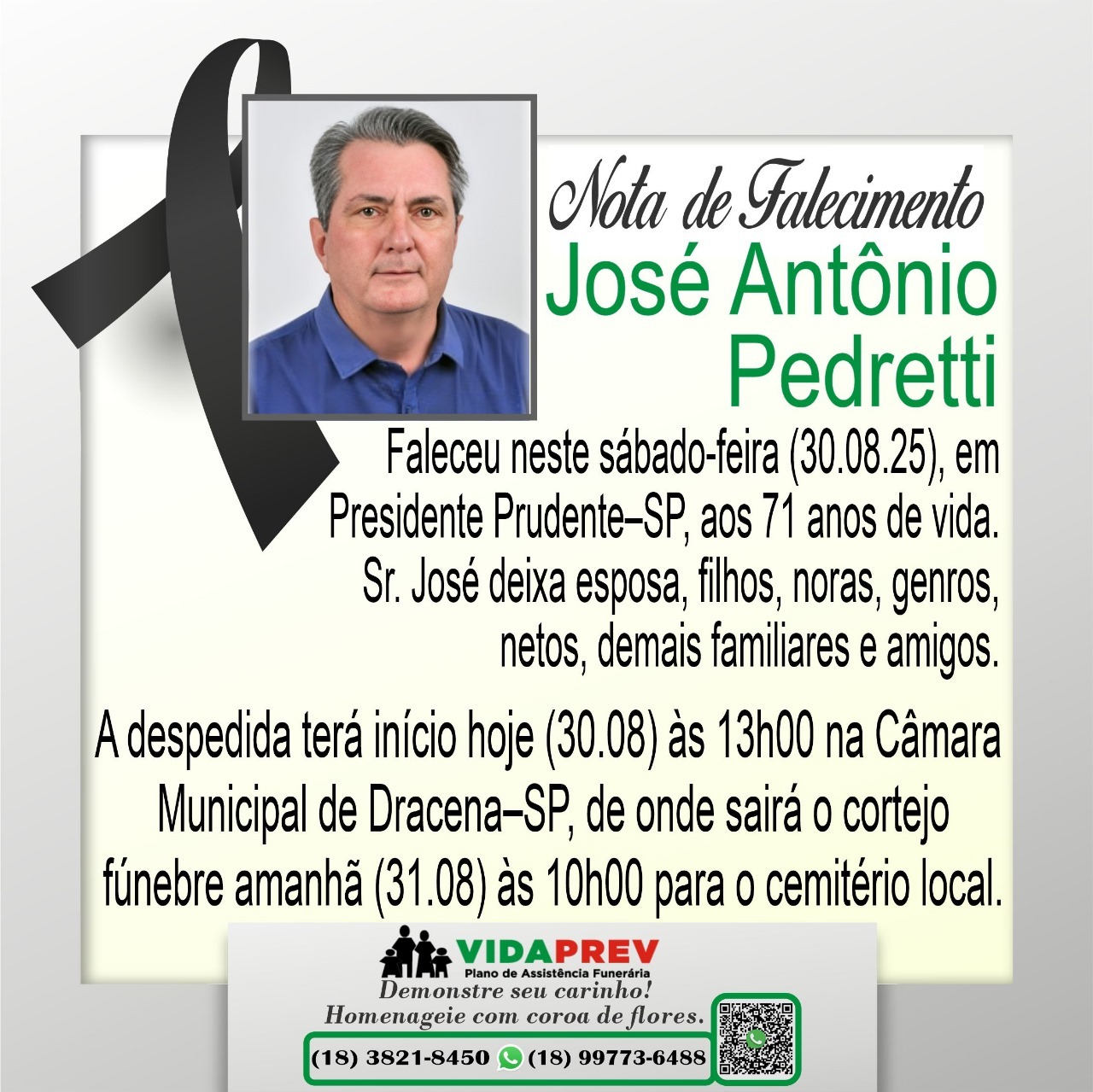Comunicamos com pesar o falecimento do ex-vereador e ex-prefeito, José Antonio Pedretti, aos 71 anos. Ele sofreu um infarto na tarde da última quinta-feira (28) e estava internado na Santa Casa de Presidente Prudente.