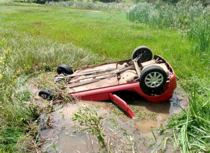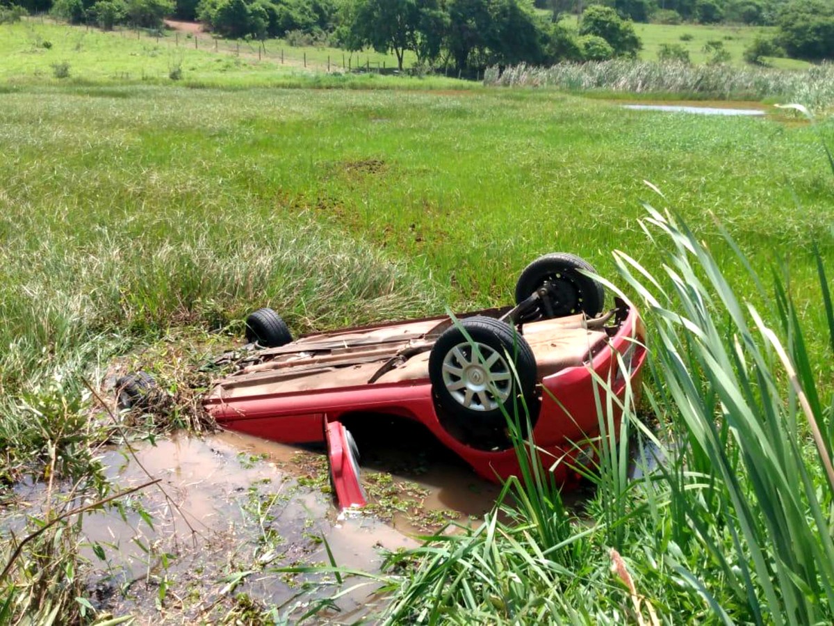 Veículo ocupado por quatro pessoas ficou dentro d’água com as rodas para cima em região de brejo de Cafelândia (SP). Motorista foi internado na UTI de hospital em Lins.