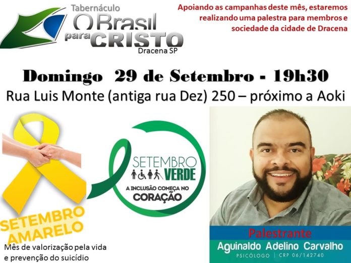 Agenda Palestra no Tabernáculo “O Brasil para Cristo” em Dracena By admin - setembro 26, 2019 0 1384 Share Facebook Twitter Google+ Pinterest WhatsApp Compartilhar no WhatsappDomingo dia 29 às 19:30 Horas. Setembro, mês de valorização pela vida e prevenção do suicídio. Compartilhar no Whatsapp