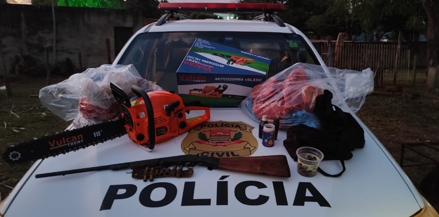 No imóvel ligado ao investigado, os policiais apreenderam aproximadamente 23 quilos de carne bovina já fracionada, uma espingarda sem numeração e de calibre indefinido, apetrechos para recarga de munição, uma motosserra e uma lanterna. A Polícia Científica foi acionada para realizar perícia no local e elaborar laudo técnico que subsidiará o inquérito policial.