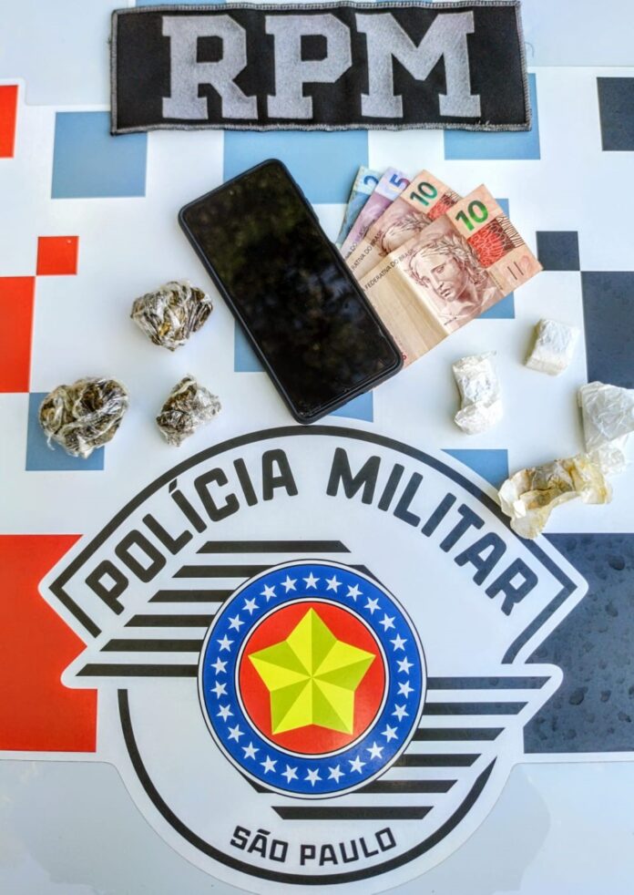 Durante abordagem foi reconhecido um indivíduo (homem 28 anos) com denúncias por tráfico de drogas. Em busca pessoal no interior de suas vestes foi localizado uma sacola amarela contendo duas porções grandes de maconha e em busca minuciosa no interior de sua carteira mais uma porção menor de maconha e duas menores de dry, e o valor de R$28,70 em notas e moedas diversas.