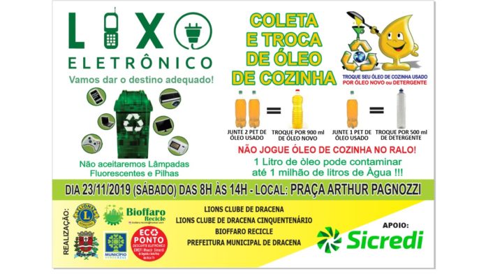Dia 23 de novembro, das 08h às 14h na Praça Arthur Pagnozzi, haverá Campanha de Recolhimento de Lixo Eletrônico e Troca de Óleo de Cozinha.